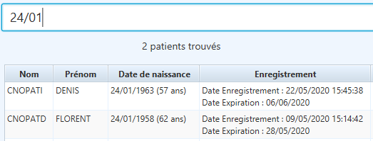 Afin de limiter le nombre de résultats, la recherche ne s’effectue qu’à partir de 2 caractères saisis. La recherche s’effectue pour chaque mot saisi et simultanément sur le nom, le prénom, l’âge ou la date de naissance et la date d’enregistrement du patient. Plus il y a de mots saisis, plus la recherche est sélective. La recherche s’effectue quel que soit la casse (majuscule, minuscule) et indépendamment des accents et caractères spéciaux. Par exemple : ‘Er’ recherche tous les noms et prénoms commençant par ‘er’ ou ‘ér’ ou ‘èr’ ou ‘êr’ ou ‘ër’.