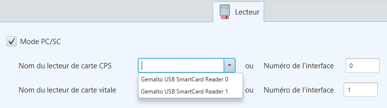 L’onglet ‘Lecteur’ permet de gérer la communication avec les lecteurs de carte Vitale et CPx. Deux modes sont disponibles :