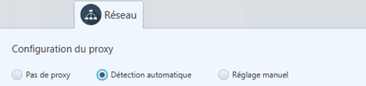 Si la connexion au réseau nécessite un PROXY, celui-ci peut être paramétré dans l’onglet ‘Réseau’. En général ce sont les mêmes paramètres qui se trouvent dans les options du navigateur Internet Explorer (‘Options Internet’ / ‘Onglet Connexion’ / bouton ‘Paramètres réseau’).