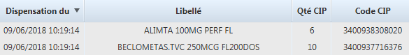 Le bouton ‘LOUPE’ permet de consulter le contenu d’un DP. Toutes les dispensations sont affichées par défaut par ordre chronologique. Le détail d’une dispensation est également affiché contenant la Date de dispensation, le Libellé, la Quantité CIP et UCD, le Code CIP et UCD, la Classe ATC et la présence dans le Livret thérapeutique des médicaments dispensés.