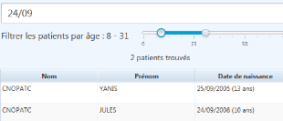 Lors de la recherche de patient, il est possible de filtrer les résultats par tranche d’âge par l’intermédiaire d’un curseur sélectif.